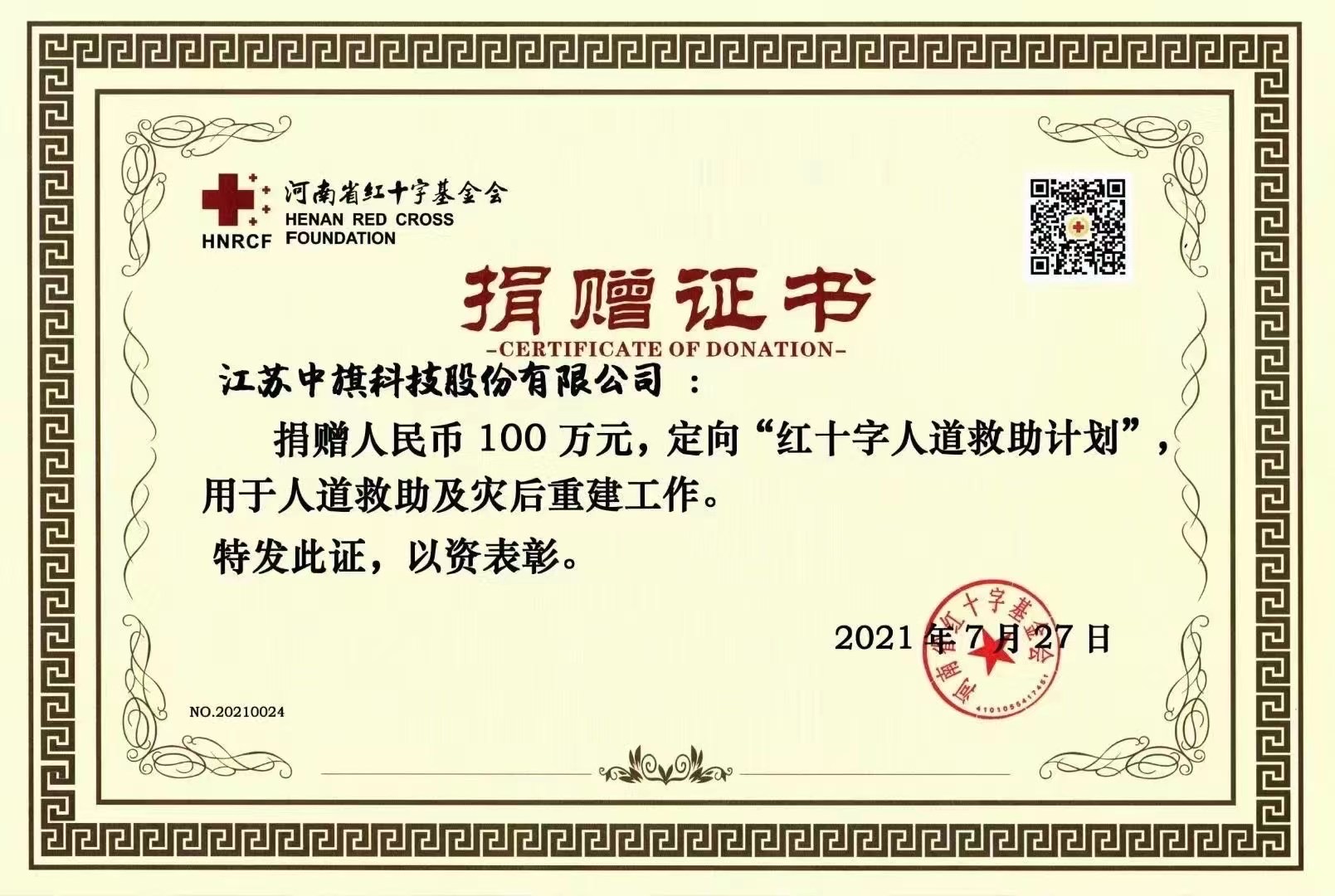 中旗科技心系災(zāi)區(qū),經(jīng)董事會決議通過向河南省紅十字基金會捐贈100萬元,定向“紅十字人道救助計劃”。
