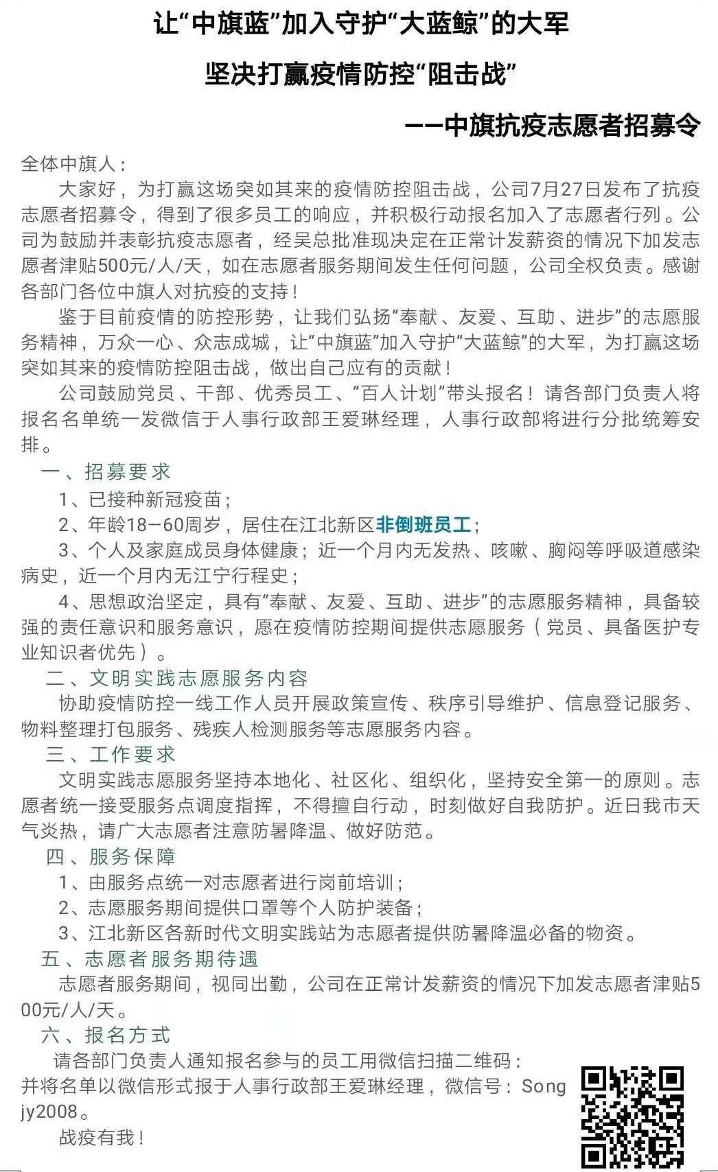 自7月20日南京祿口爆發新一輪新冠疫情以來,中旗科技立即行動組織全員應對這場防疫攻堅戰。根據政府防疫布控要求,嚴格落實各項防疫防控措施。確保每位員工做好個人防護、定時定點核酸檢測。公司還于7月27日、29日兩度發布中旗科技“抗疫志愿者招募令”,倡議符合條件的員工,尤其是黨員、干部、優秀員工、“百人計劃”積極報名,志愿加入江北新區疫情防控一線工作中,協助開展政策宣傳、秩序引導、檢測協助等社會防疫活動。通知一經發布,得到了中旗員工廣泛響應和積極報名。